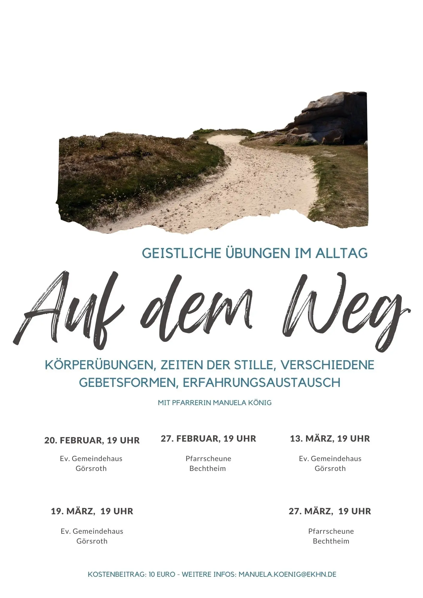 An fünf Abenden laden wir um 19.00 Uhr in die Pfarrscheune Bechtheim oder in das Ev. Gemeindehaus Görsroth ein zu „Geistlichen Übungen im Alltag“.