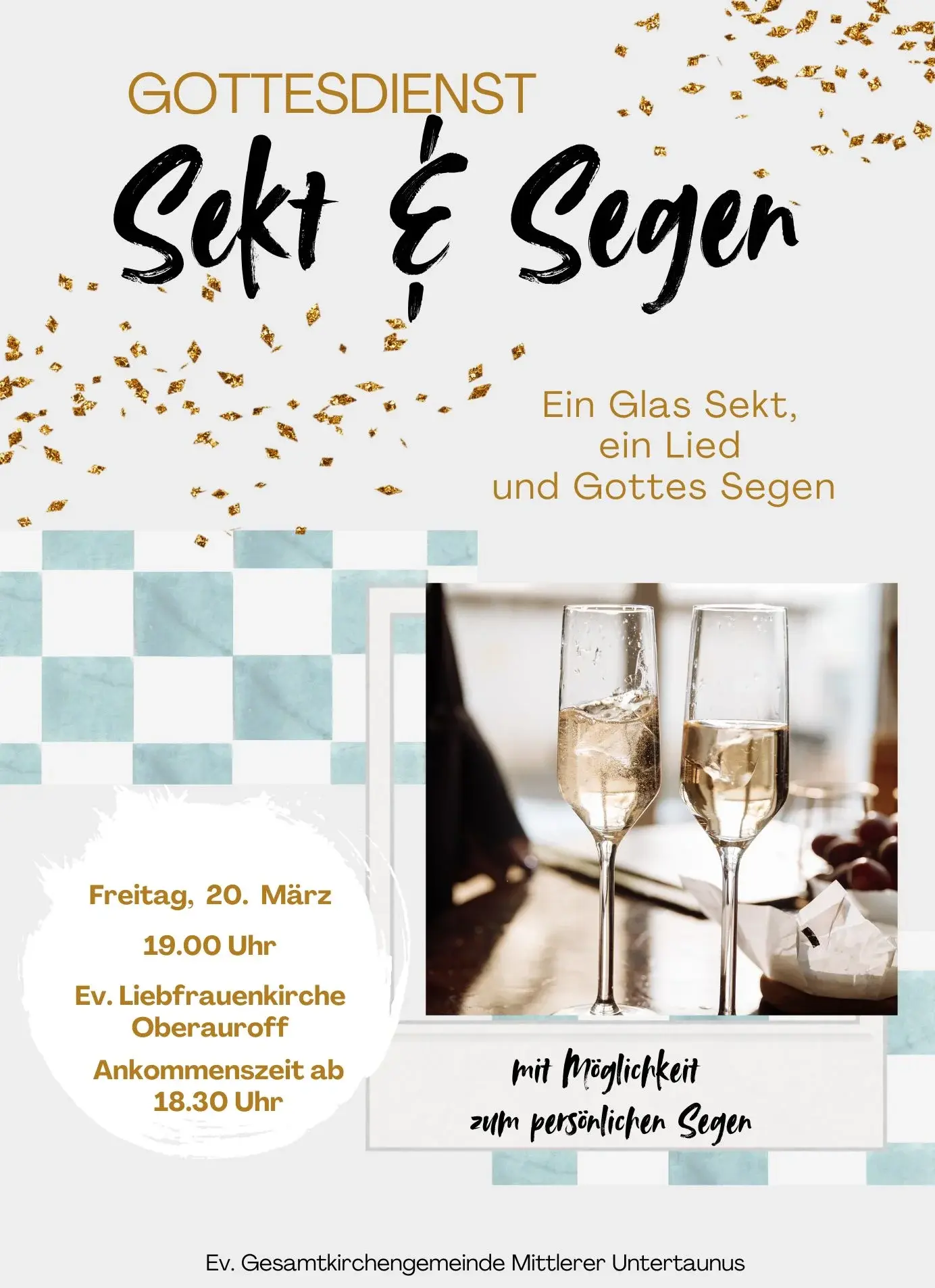 Immer wieder freitags zum Abschluss der Arbeitswoche laden wir ein zu „Sekt & Segen“. Wo es nach anderen Gottesdiensten ein „Kirchcafé“ gibt, gibt es hier eine „Willkommenszeit“. Schon ab 18.30 steht ein Team bereit, das die Gäste mit einem Glas Sekt begrüßt. Es ist Zeit für Begegnungen und Gespräche. Wenn um 19.00 Uhr der Gottesdienst beginnt, kann das Sektglas gerne mit in die Kirchenband genommen werden.