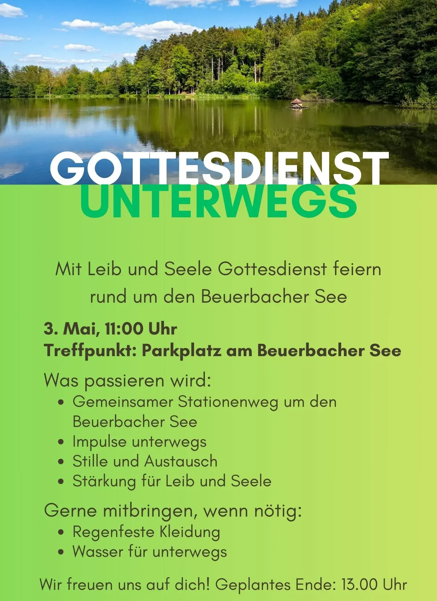 Beim „Gottesdienst unterwegs“ gehen wir gemeinsam einen kurzen Rundweg (ca. 2 Kilometer) teilweise auf befestigten Straßen, teilweise auf Wald- oder Feldwegen.