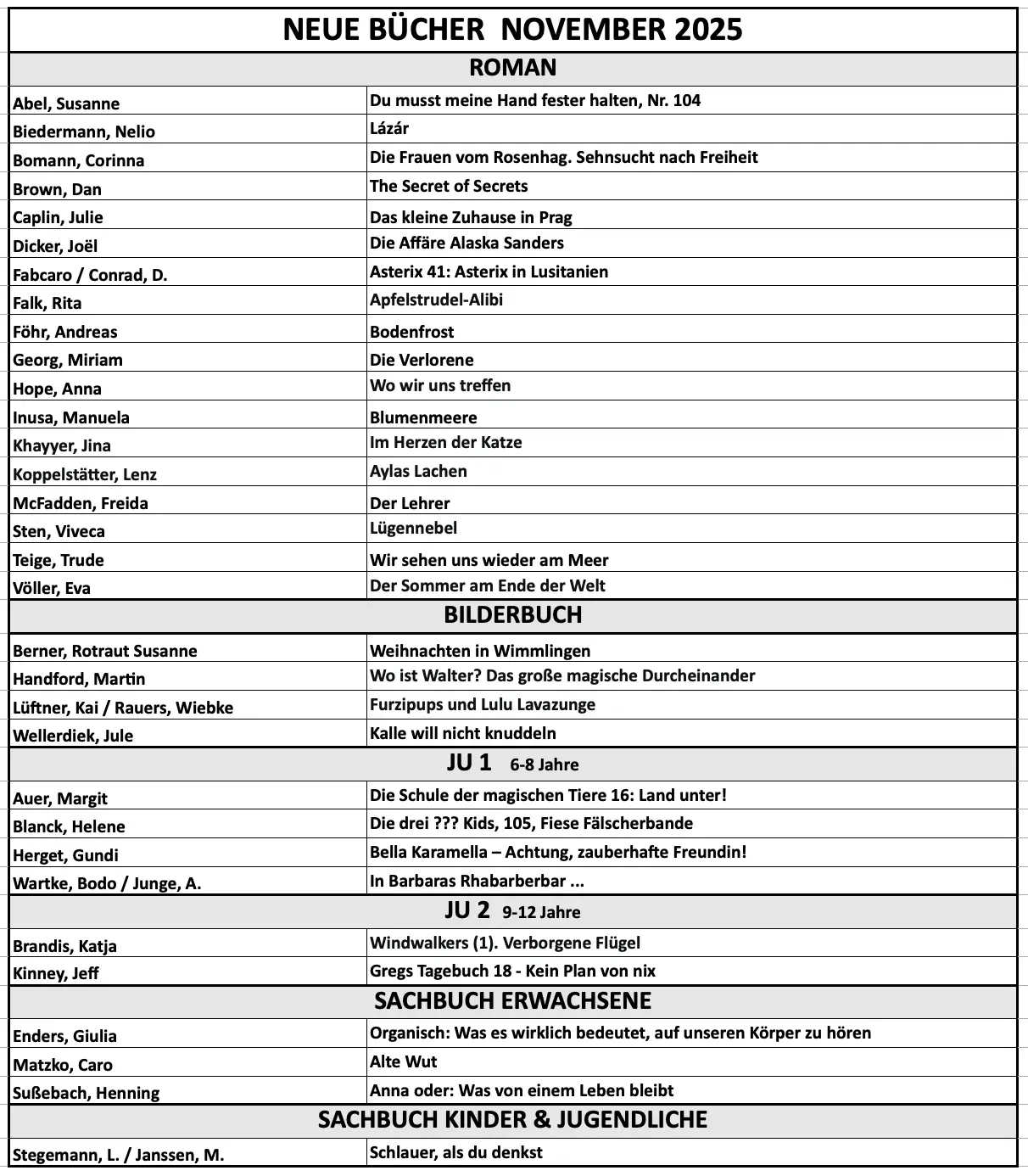 Unser Bestand wird regelmäßig durch neue Titel ergänzt, so dass viele aktuelle Bestseller zur Ausleihe bereit stehen.